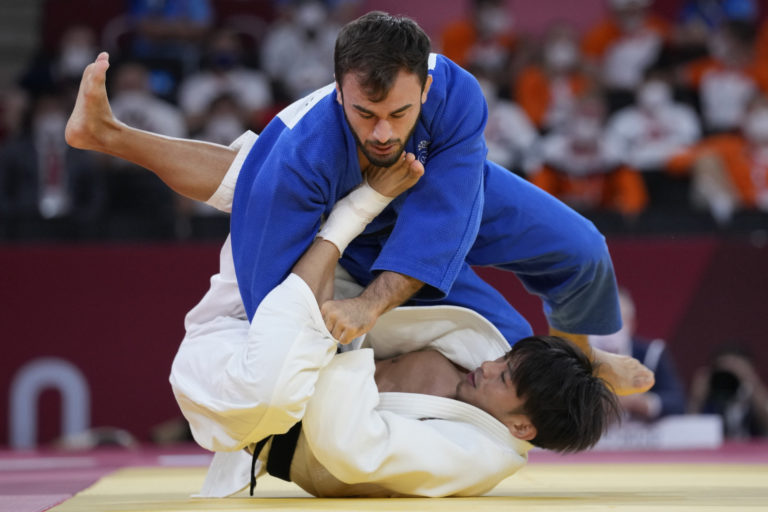 Francúz Luka Mkheidze (zhora) v zápase s Yang Yung-weiom z Taiwanu počas letných olympijských hier v Tokiu. Japonsko, Tokio, 24. júla 2021. Foto: SITA/AP