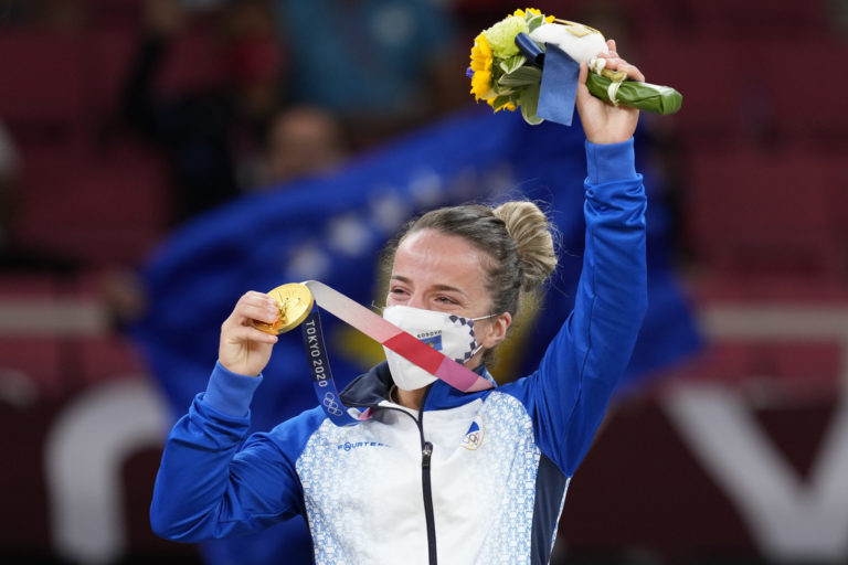 Zlatá olympijská medailistka z Kosova Distria Krasniqi získala vzácny kov v disciplíne judo na Letných olympijských hrách 2020/2021 v Tokiu. Japonsko, Tokio, 24. júl 2021. Foto: SITA/AP