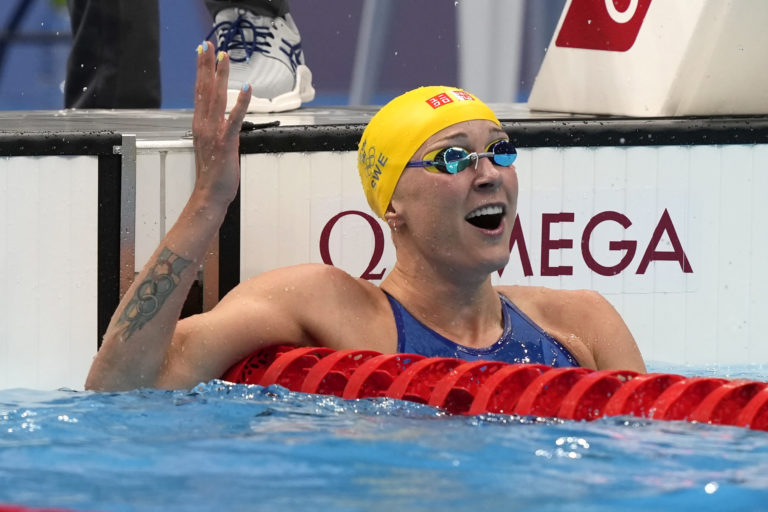 Švédska plavkyňa Sarah Sjoestroem po dokončení pretekov motýlika na 100 m počas Letných olympijských hier 2020/2021 v Tokiu. Japonsko, Tokio, 24. júl 2021. Foto: SITA/AP