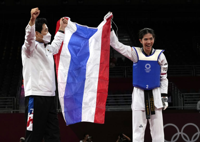 Thajčanka Panipak Wongphatthanakit (vpravo) so svojím trénerom sa tešia zo zisku zlatej medaily v teakwondo žien do 49 kg na Letných olympijských hrách 2020/2021 v Tokiu. Japonsko, Tokio, 24. júl 2021. Foto: SITA/AP