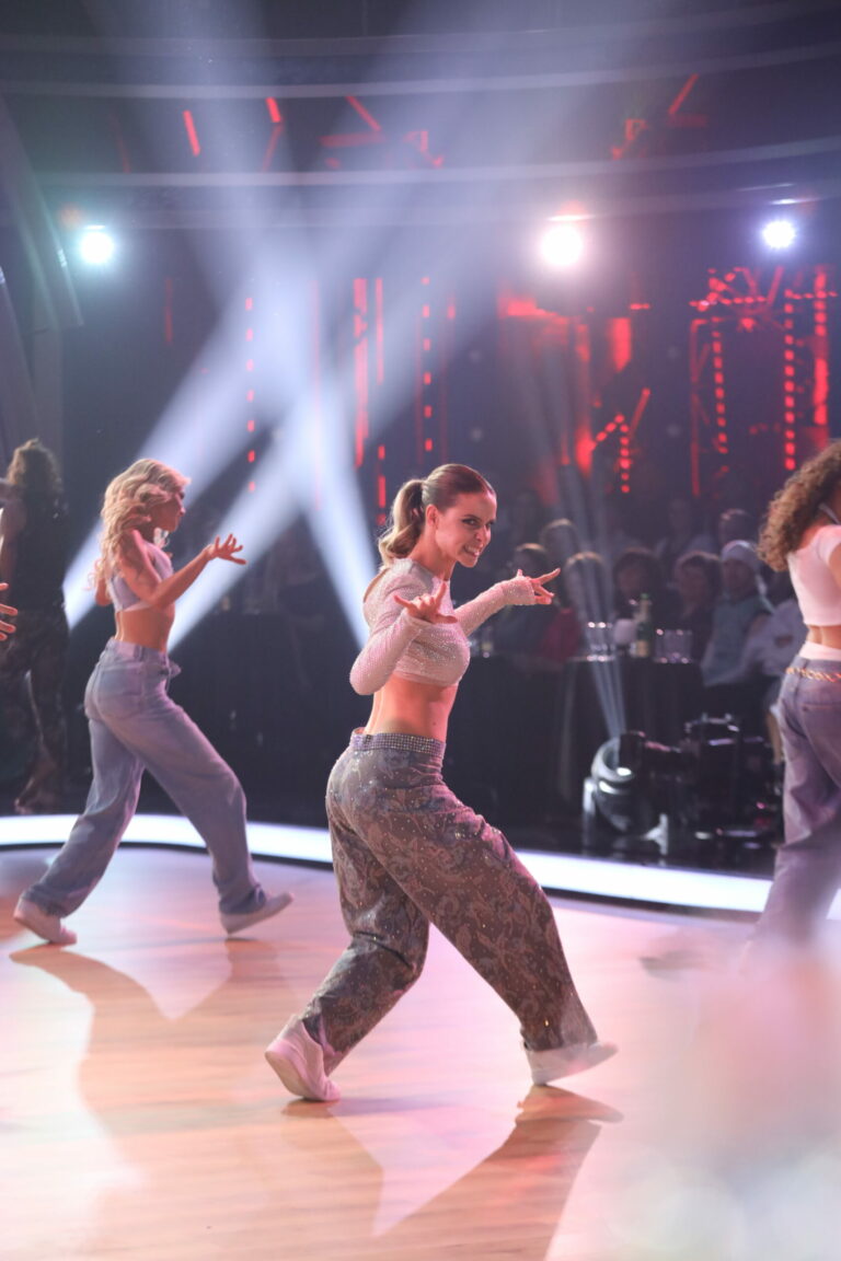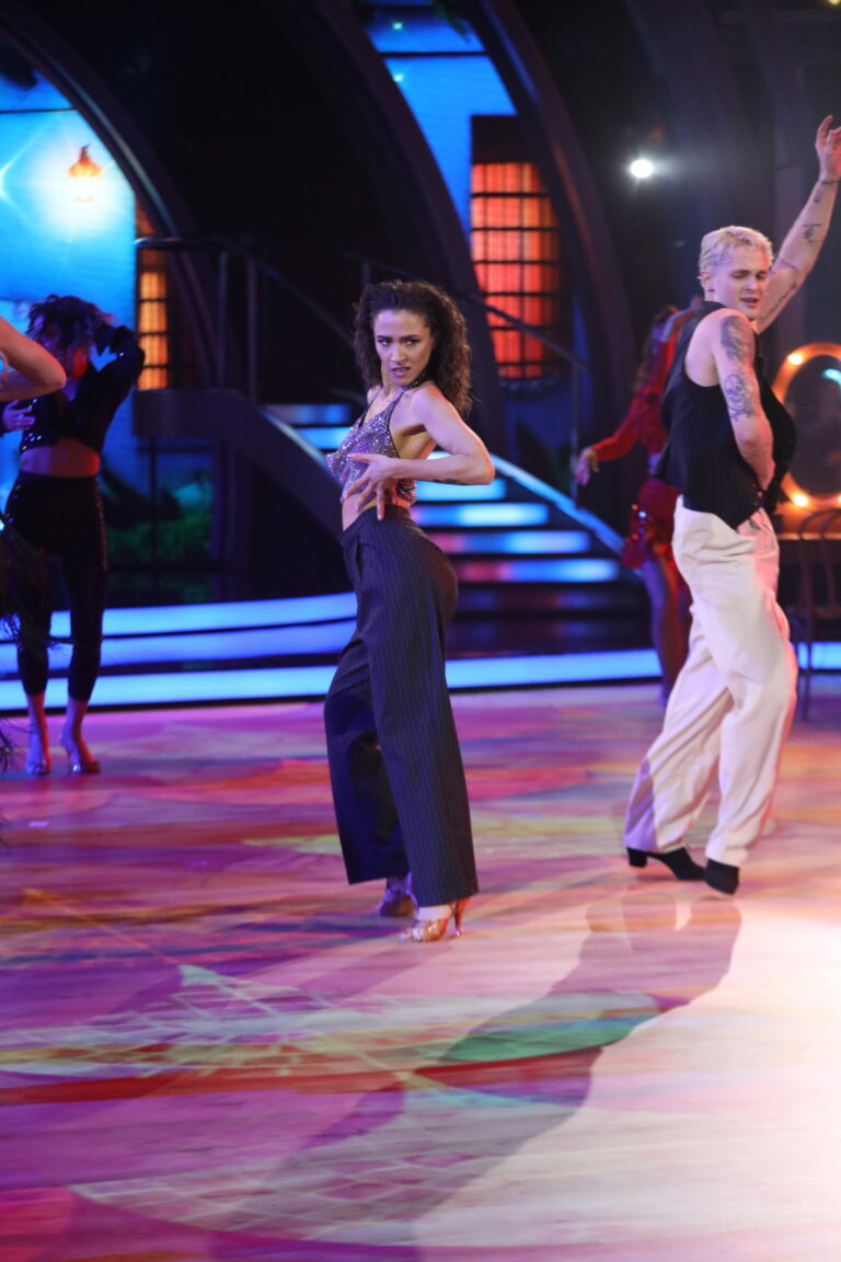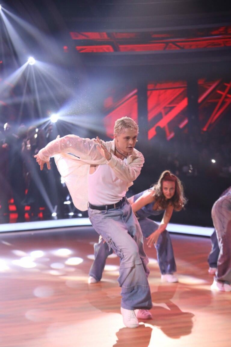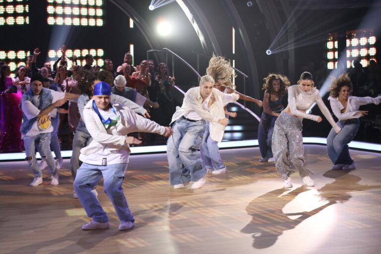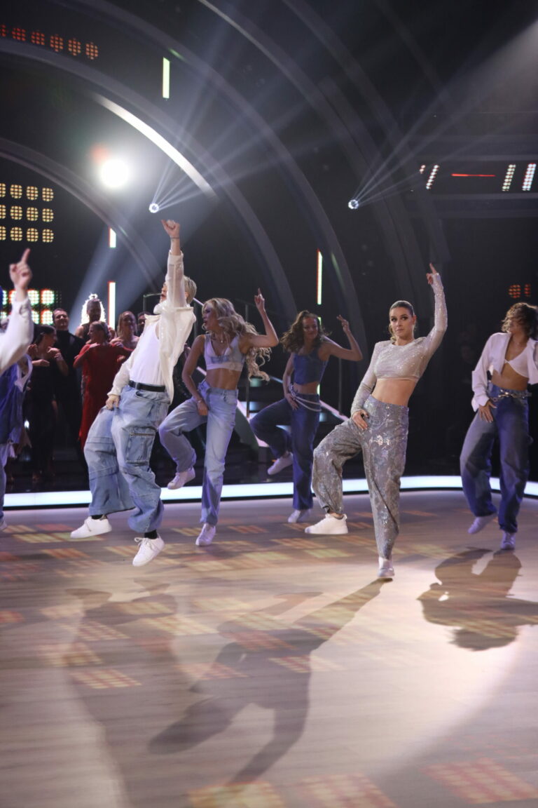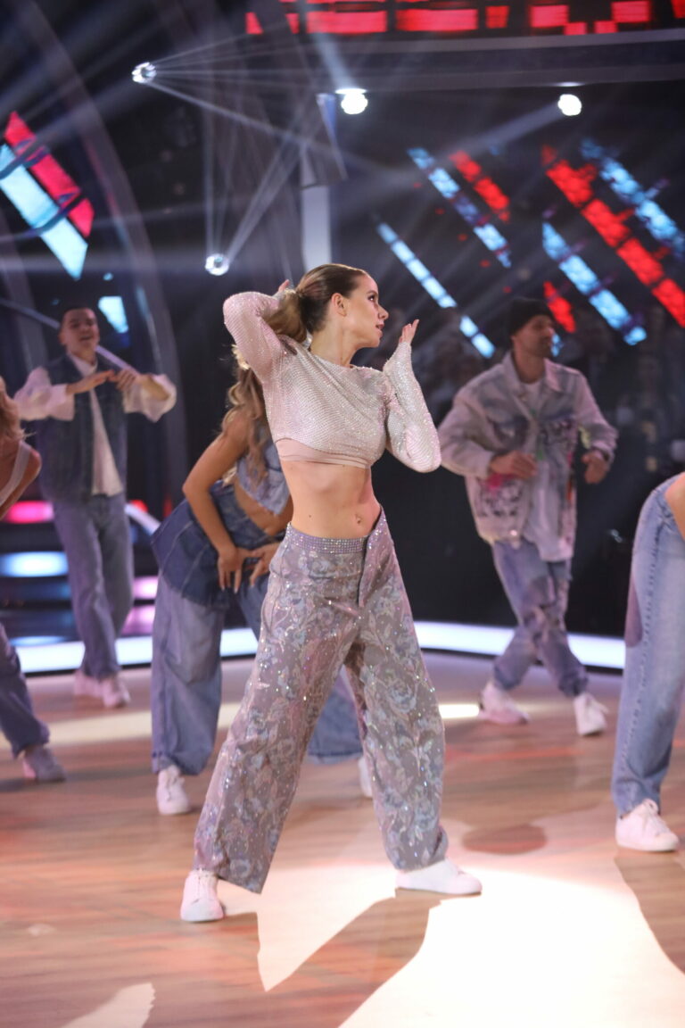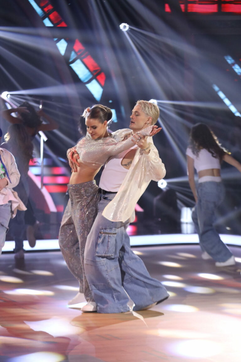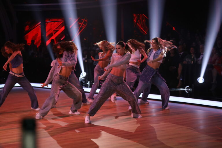 Eva Burešová a Matyáš Adamec v 5. kole Let’s Dance 2025 tancovali sambu a spoločne s nimi sa na parkete predstavili aj tanečníci z KRS Movement. Bratislava, 30. marec 2025. Foto: TV Markíza.