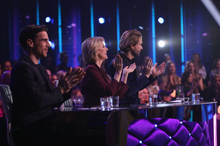 Zľava: Porotcovia Adam Bardy, Tatiana Drexler a Ján Ďurovčík počas tretieho kola Let’s Dance 2025. Bratislava, 16. marec 2025. Foto: TV Markíza.