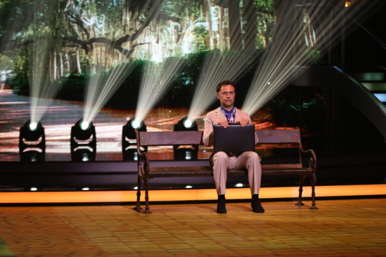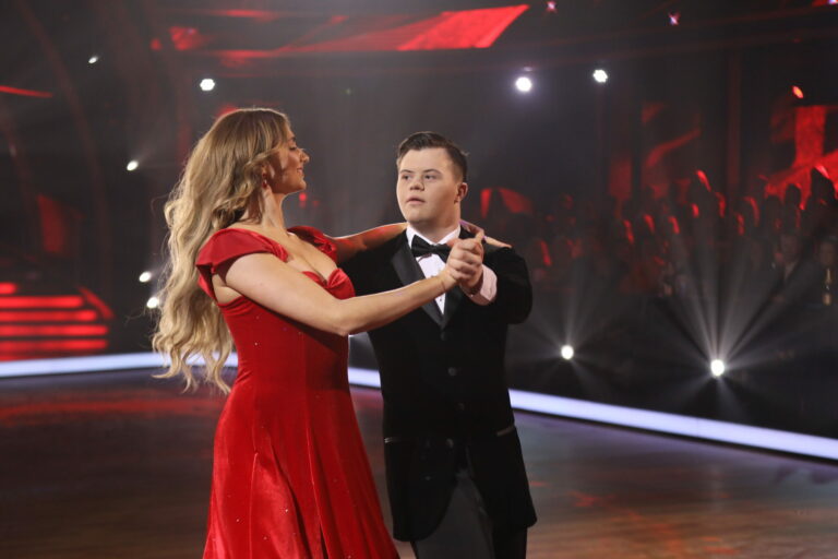 Juraj Kemka sa v treťom kole Let’s Dance 2025 premenil na Forresta Gumpa a spoločne a Natáliou Glosíkovou zatancovali rumbu. Bratislava, 16. marec 2025. Foto: TV Markíza.