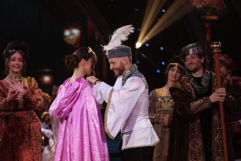 Simona Leskovská ako Popoluška v treťom kole Let’s Dance 2025 a spoločne s Vilémom Šírom zatancovali viedenský valčík. Bratislava, 16. marec 2025. Foto: TV Markíza.