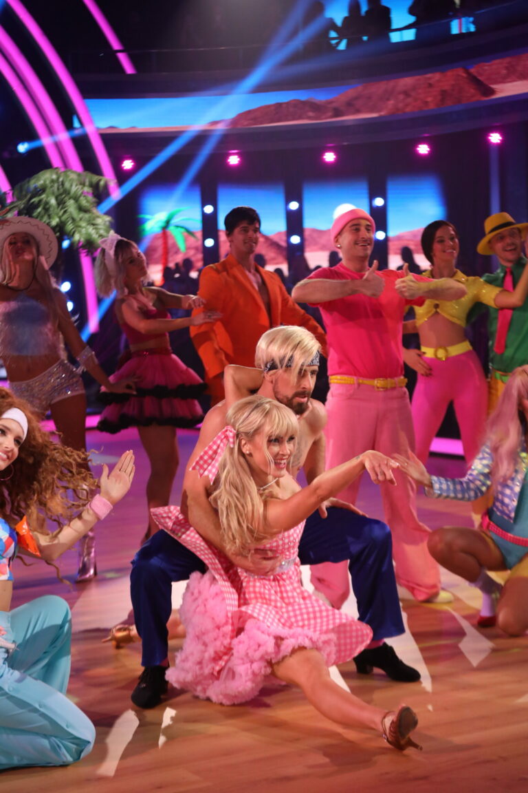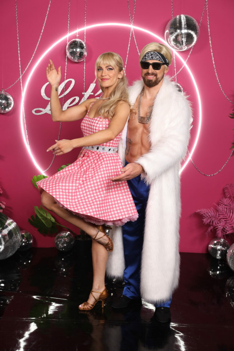 Peter Sagan ako Ken a Eliška "Barbie" Lenčešová počas tretieho kola Let’s Dance 2025, v ktorom tancovali čaču. Bratislava, 16. marec 2025. Foto: TV Markíza.