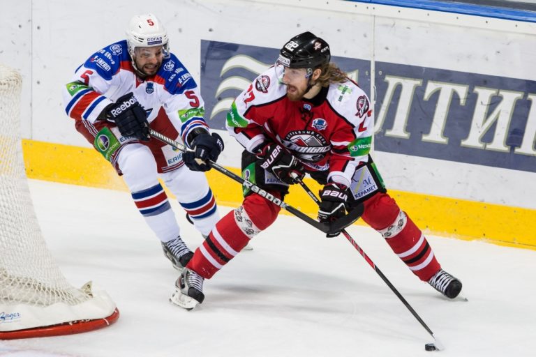 Zľava: Hráč Donbasu Peter Podhradský a hráč Lev Praha Nathan Oystrick počas tretieho zápasu semifinále play-off Západnej konferencie Kontinentálnej hokejovej ligy (KHL) medzi Donbas Doneck a HC Lev Praha. Bratislava, 23. marec 2014. Foto: SITA/Jozef Jakubčo