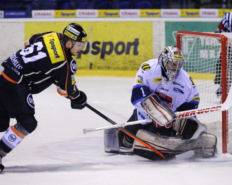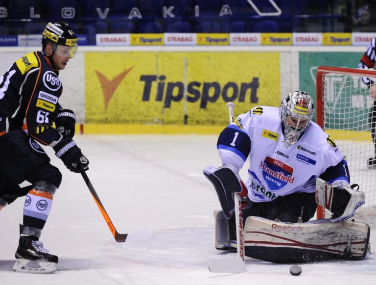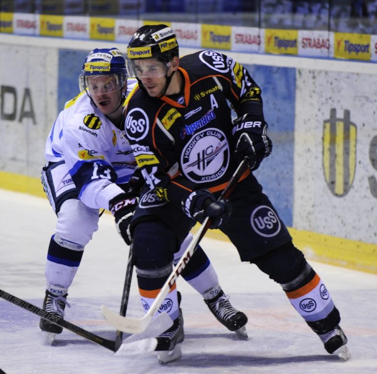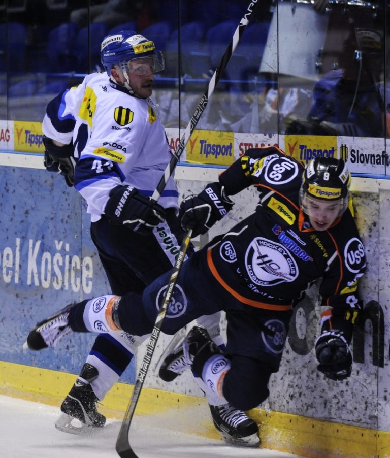 Zľava: Marek Bartánus z Košíc a Jakub Čech z Martina v zápase HC Košice - MHC Mountfield Martin 49. kola hokejovej Tipsport extraligy. Košice, 14. február 2014. Foto: SITA/Ivan Fleischer