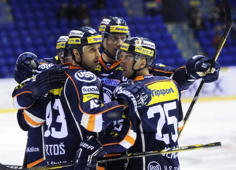 Košickí hráči sa tešia z gólu v zápase HC Košice - MHC Mountfield Martin 49. kola hokejovej Tipsport extraligy. Košice, 14. február 2014. Foto: SITA/Ivan Fleischer