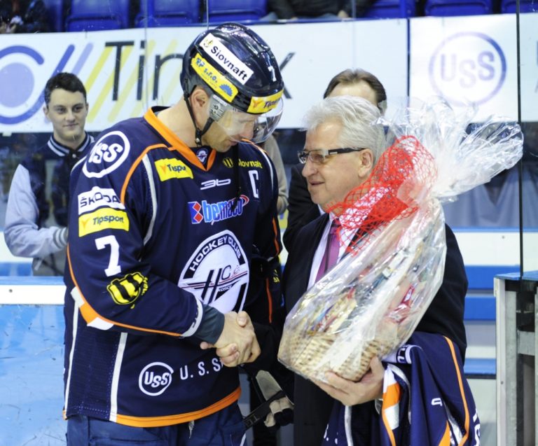 Zľava: Prezident HC Košice Juraj Mondík odovzdáva dres s číslom 60 Vincentovi Lukáčovi k jeho 60. narodeninám pred zápasom hokejovej extraligy HC Košice - MHC Martin. Košice, 14. február 2014. Foto: SITA/Ivan Fleischer