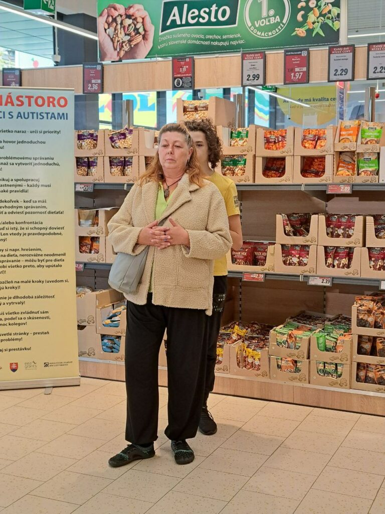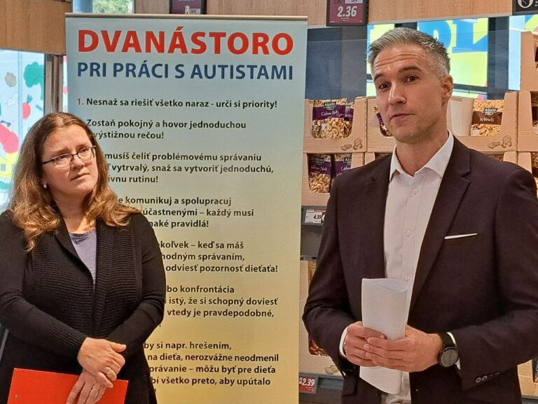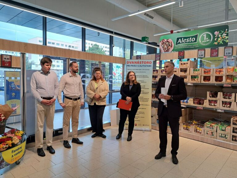 Sprava: Hovorca spoločnosti Lidl Tomáš Bezák, riaditeľ SPOSA Ivan Štubňa, jeho brat Michal Štubňa s autizmom. Foto: SITA/Slávka Ambrová