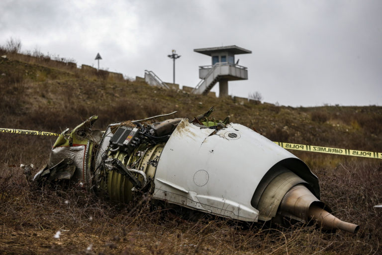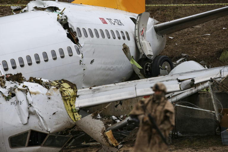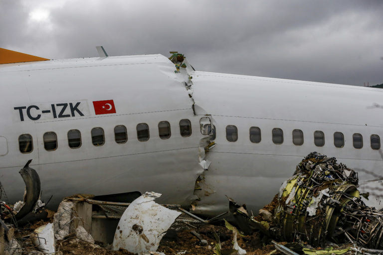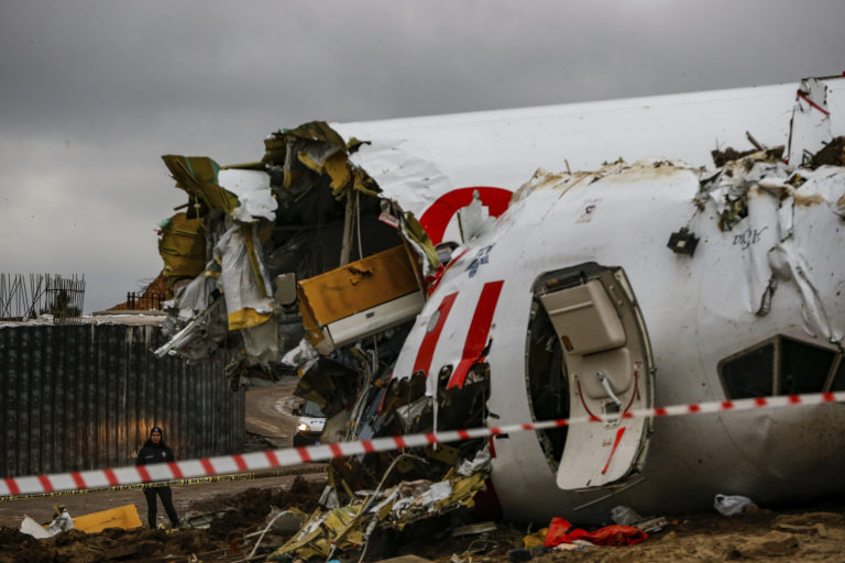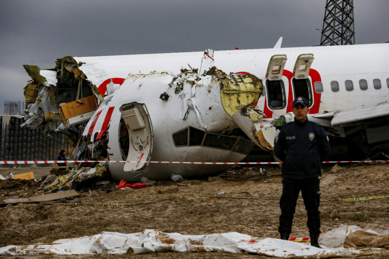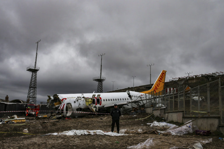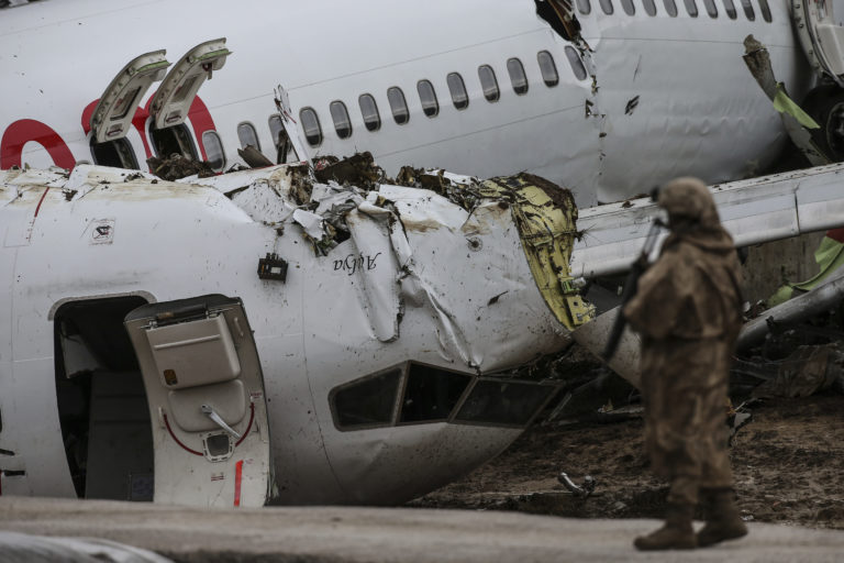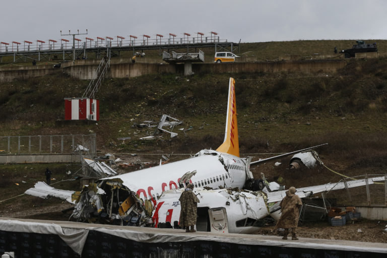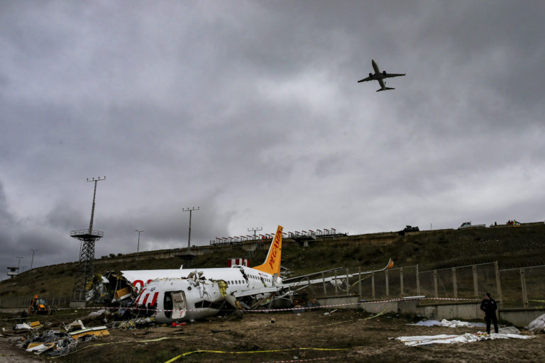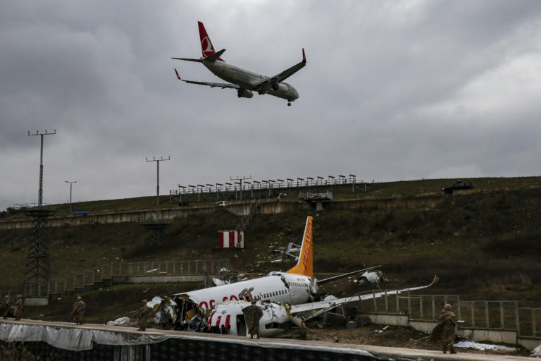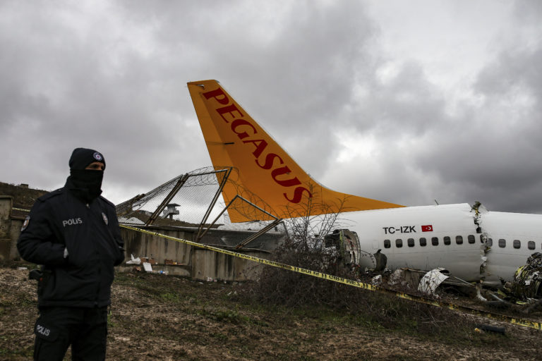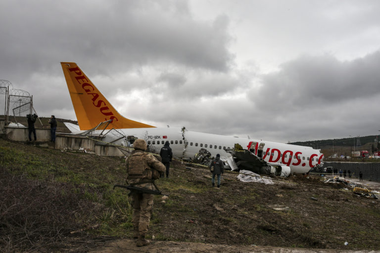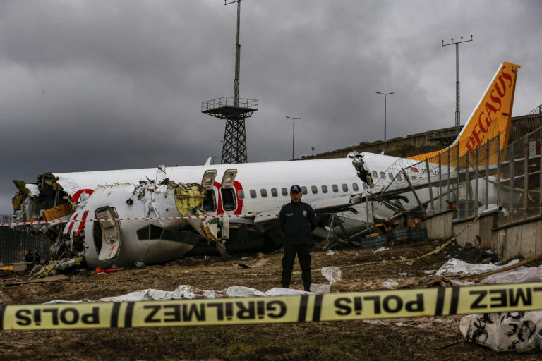Turecká polícia stráži vrak lietadla spoločnosti Pegasus Airlines, ktoré dostalo šmyk na letiskovej dráhe v istanbulskom letisku Sabiha Gokcen 6. februára 2020. Foto: SITA/AP
