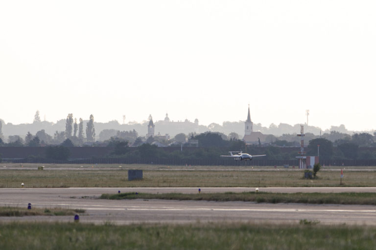Experimentálne lietajúce auto AirCar počas prvého príletu na Letisko M. R. Štefánika. Bratislava, 28. jún 2021. Foto: SITA/Branislav Bibel