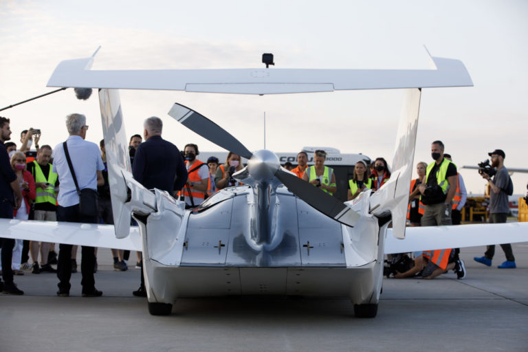 Lietajúce auto AirCar počas prvého príletu experimentálneho lietadla AirCar na Letisko M. R. Štefánika. Bratislava, 28. jún 2021. Foto: SITA/Branislav Bibel