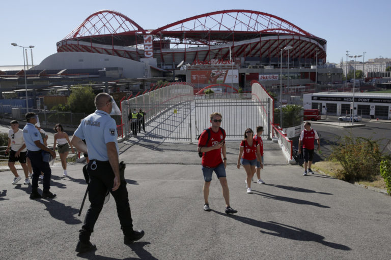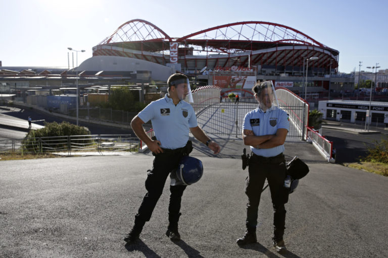 Policajti pred lisabonským Štadiónom Svetla pred finále Ligy majstrov medzi PSG a Bayernom Mníchov. Lisabon, 23. august 2020. Foto: SITA/AP.