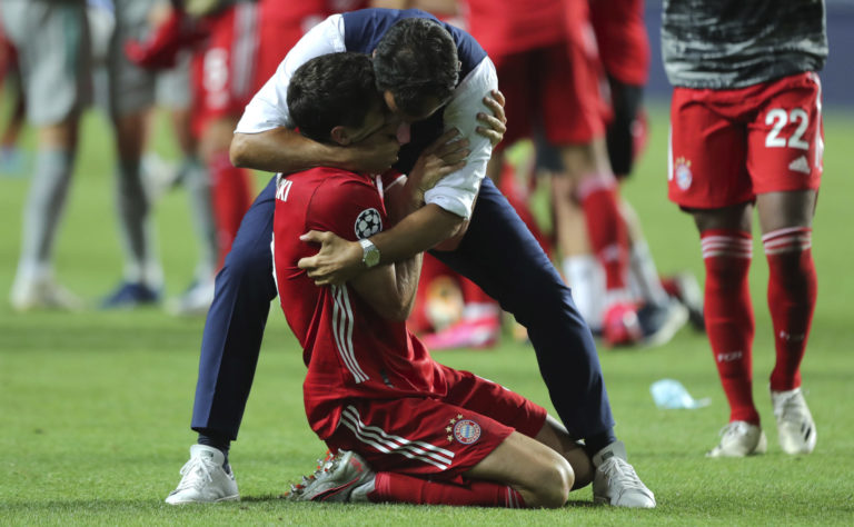 Hráč Bayernu Robert Lewandowski oslavuje víťazstvo po finále Ligy majstrov na Estádio da Luz. Lisabon, 23. august 2020. Foto: SITA/AP