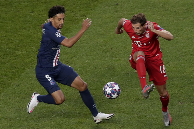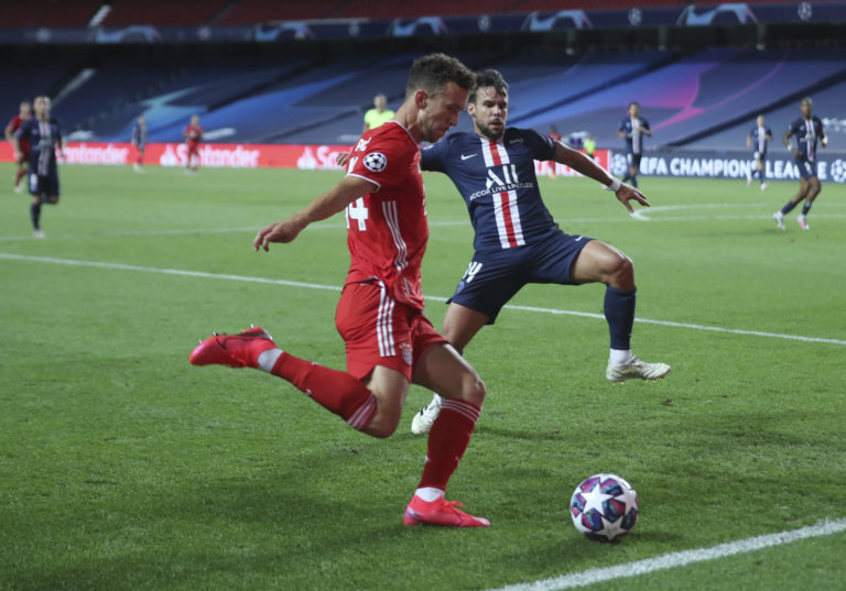 Juan Bernat z PSG sa snaží zastaviť center Ivana Perišiča z PSG počas finále Ligy majstrov na Estádio da Luz. Lisabon, 23. august 2020. Foto: SITA/AP