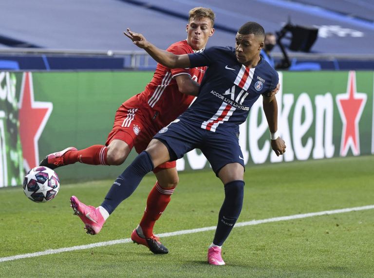 Joshua Kimmich z Bayernu (vľavo) a Kylian Mbappe z PSG počas finále Ligy majstrov na Estádio da Luz. Lisabon, 23. august 2020. Foto: SITA/AP