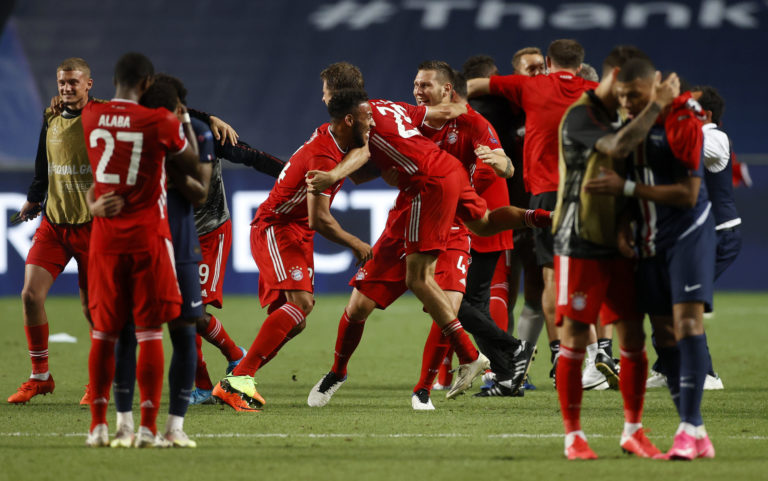 Hráči Bayernu Mníchov oslavuju triumf vo finále Ligy majstrov na Estádio da Luz. Lisabon, 23. august 2020. Foto: SITA/AP