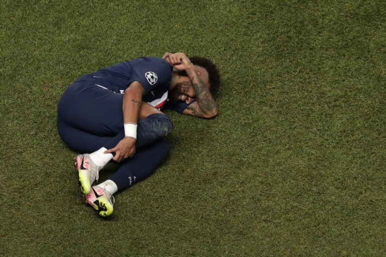 Hráč PSG Neymar na zemi počas finále Ligy majstrov na Estádio da Luz. Lisabon, 23. august 2020. Foto: SITA/AP