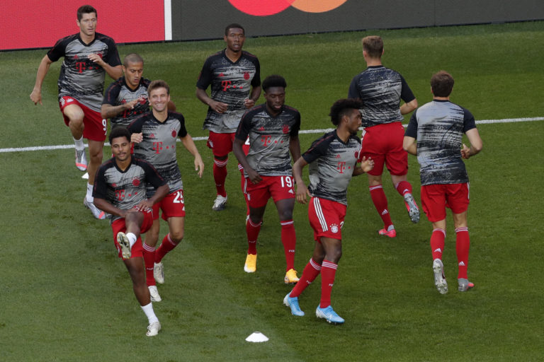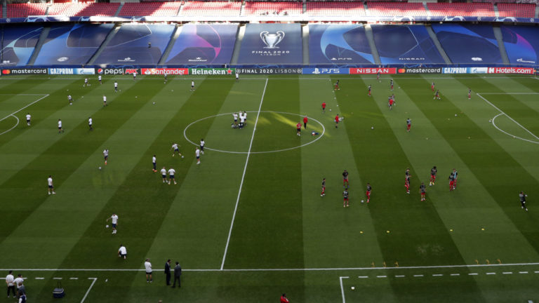 Rozcvička hráčov Bayernu Mníchov a Paríža St. Germain pred finále Ligy majstrov na Estádio da Luz. Lisabon, 23. august 2020. Foto: SITA/AP.