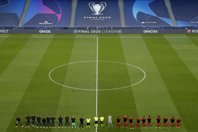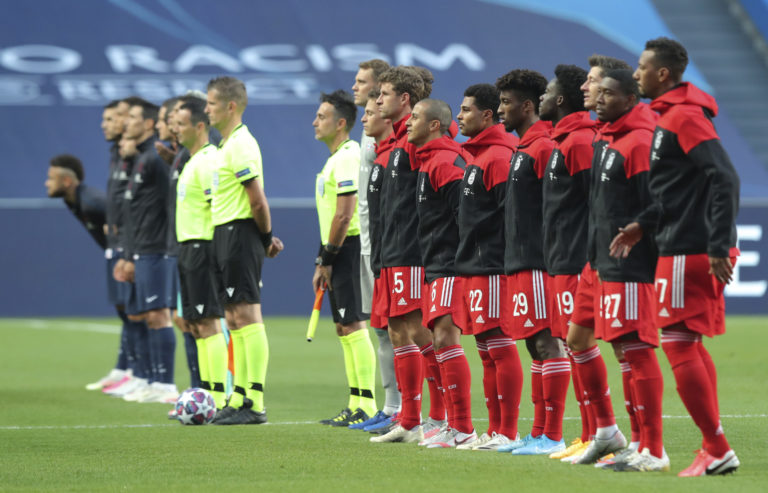 Hráči Bayernu Mníchov a Paríža St. Germain pred finále Ligy majstrov na Estádio da Luz. Lisabon, 23. august 2020. Foto: SITA/AP.