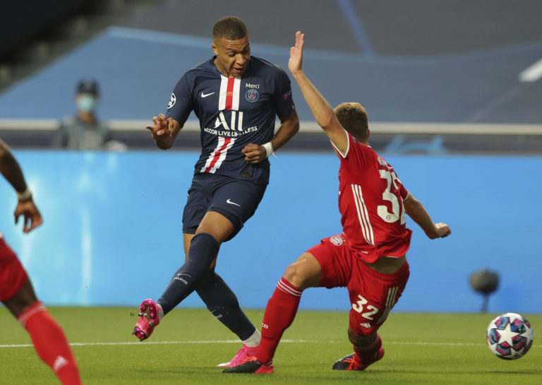 (vpravo) z Bayernu v súboji o loptu s Kylianom Mbappem z PSG počas finále Ligy majstrov na Estádio da Luz. Lisabon, 23. august 2020. Foto: SITA/AP
