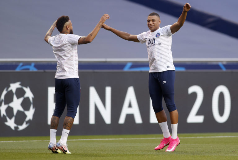Kylian Mbappé a Neymar počas rozcvičky pred finále Ligy majstrov proti Bayernu Mníchov na Estádio da Luz. Lisabon, 23. august 2020. Foto: SITA/AP.