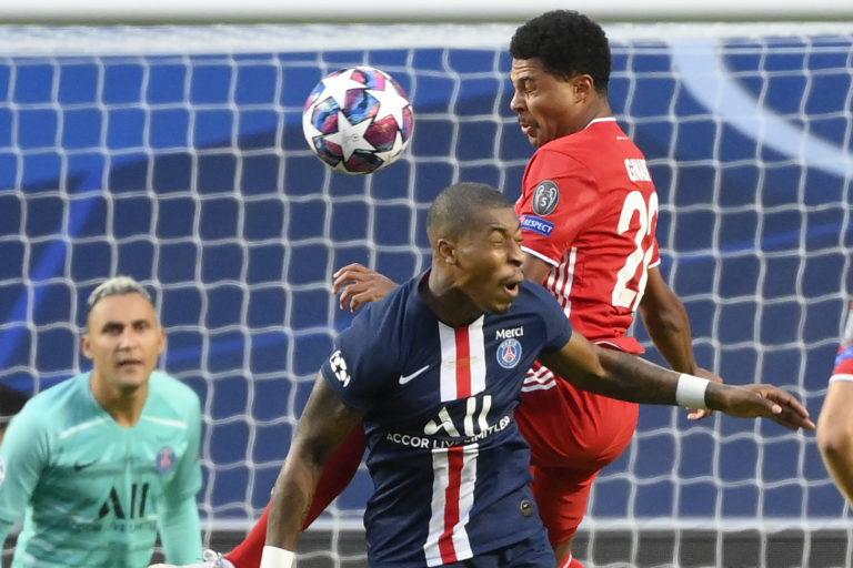 Hráč Bayernu Serge Gnabry (vpravo) hlavičkuje pred Presnelom Kimpembem z PSG počas finále Ligy majstrov na Estádio da Luz. Lisabon, 23. august 2020. Foto: SITA/AP
