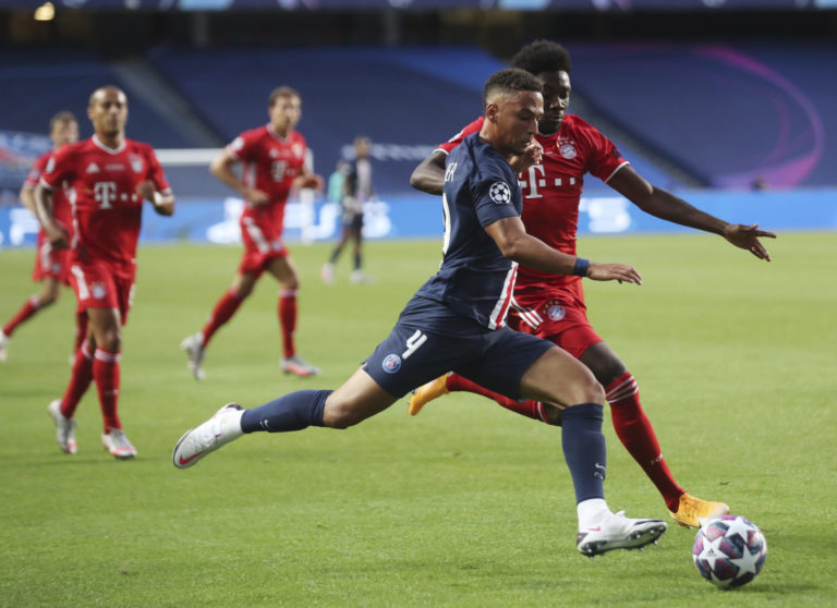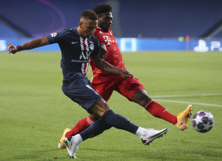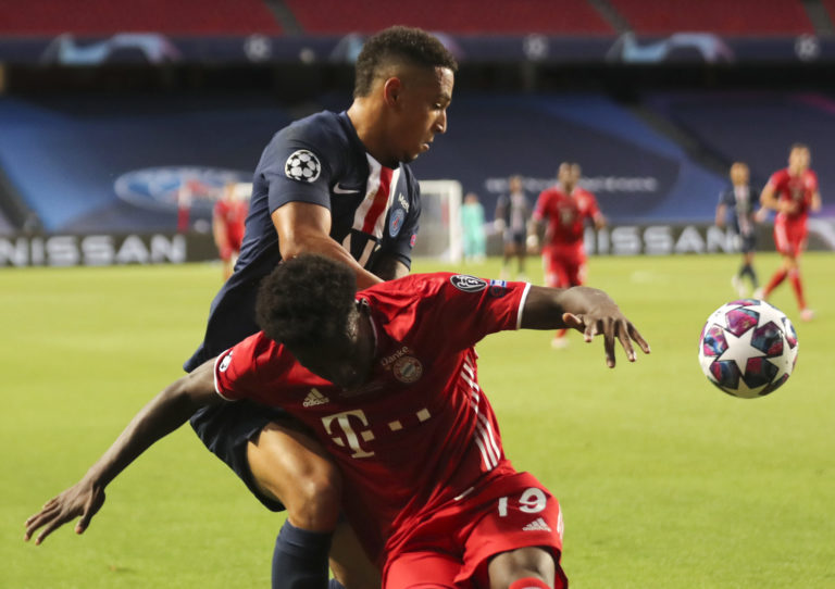 Hráč PSG Thilo Kehrer (vzadu) v súboji s Alphonsom Daviesom z Bayernu počas finále Ligy majstrov na Estádio da Luz. Lisabon, 23. august 2020. Foto: SITA/AP