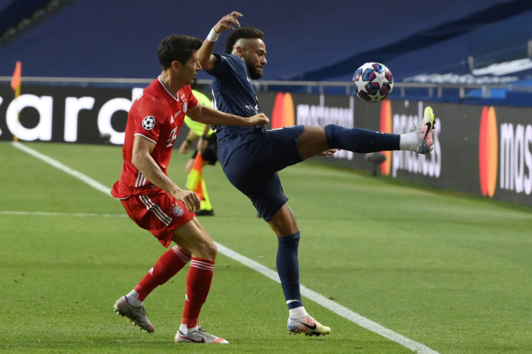 Hráč PSG Neymar (vpravo) v súboji o loptu s Robertom Lewandowskim z Bayernu počas finále Ligy majstrov na Estádio da Luz. Lisabon, 23. august 2020. Foto: SITA/AP