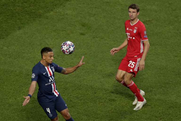 Thilo Kehrer (vľavo) z PSG spracúva loptu pred hráčom Bayernu Thomasom Muellerom počas finále Ligy majstrov na Estádio da Luz. Lisabon, 23. august 2020. Foto: SITA/AP