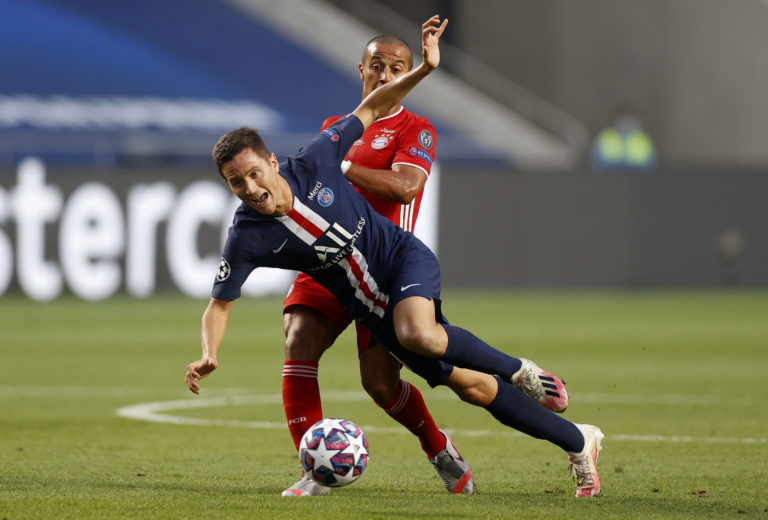 Ander Herrera z PSG (vpredu) padá po súboji s hráčom Bayernu Thiagom počas finále Ligy majstrov na Estádio da Luz. Lisabon, 23. august 2020. Foto: SITA/AP