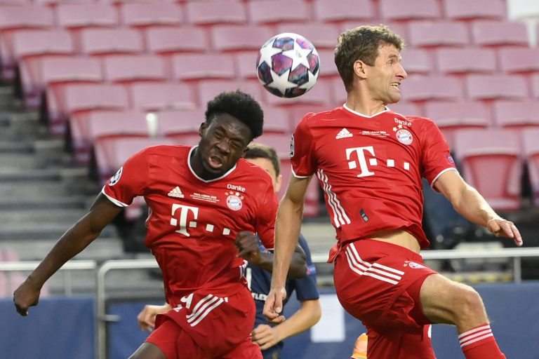 Hráč Byernu Alphonso Davies (vpravo) v súboji s Thilo Kehrerom z Bayernu počas finále Ligy majstrov na Estádio da Luz. Lisabon, 23. august 2020. Foto: SITA/AP