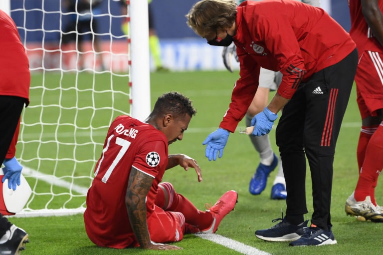 Zranený Jerome Boateng opúšťa ihrisko počas finále Ligy majstrov na Estádio da Luz. Lisabon, 23. august 2020. Foto: SITA/AP