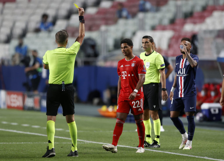 Serge Gnabry z Bayernu Mníchov dostáva žltú kartu počas finále Ligy majstrov na Estádio da Luz. Lisabon, 23. august 2020. Foto: SITA/AP