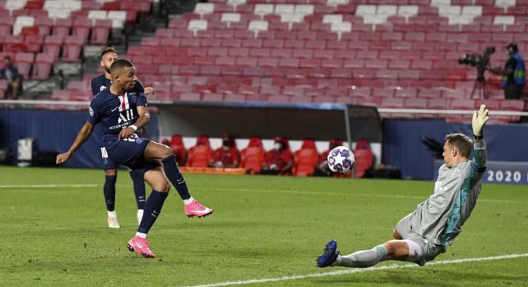 Brankár Bayernu Mníchov Manuel Neuer zneškodňuje príležitosť Kyliana Mbappeho z PSG počas finále Ligy majstrov na Estádio da Luz. Lisabon, 23. august 2020. Foto: SITA/AP