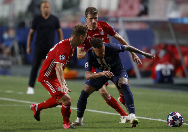 Hráč PSG Neymar (vpravo) bránený hráčmi Bayernu Joshuom Kimmichom (vľavo) a Thomasom Muellerom počas finále Ligy majstrov na Estádio da Luz. Lisabon, 23. august 2020. Foto: SITA/AP
