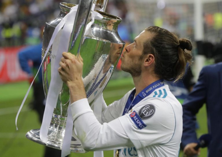 Gareth Bale, strelec dvoch gólov Realu Madrid, bozkáva "ušatú trofej" víťaza Ligy majstrov. 26. máj 2018 Foto: SITA/AP