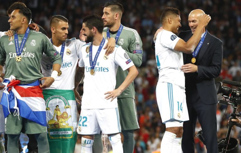 Hráči Realu Madrid s trénerom Zinedinom Zidaneom po víťazstve nad FC Liverpool a triumfe vo finále Ligy majstrov. 26. máj 2018 Foto: SITA/AP
