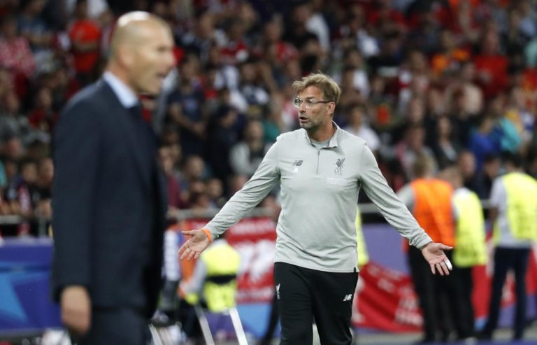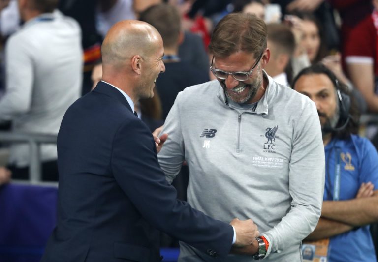 Zľava: Tréner Realu Madrid Zinedine Zidane a tréner FC Liverpool Jurgen Klopp počas finále Ligy majstrov. 26. máj 2018 Foto: SITA/AP