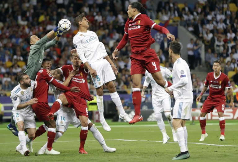Sergio Ramos z Realu Madrid hlavičkuje počas finále Ligy majstrov proti FC Liverpool. 26. máj 2018 Foto: SITA/AP
