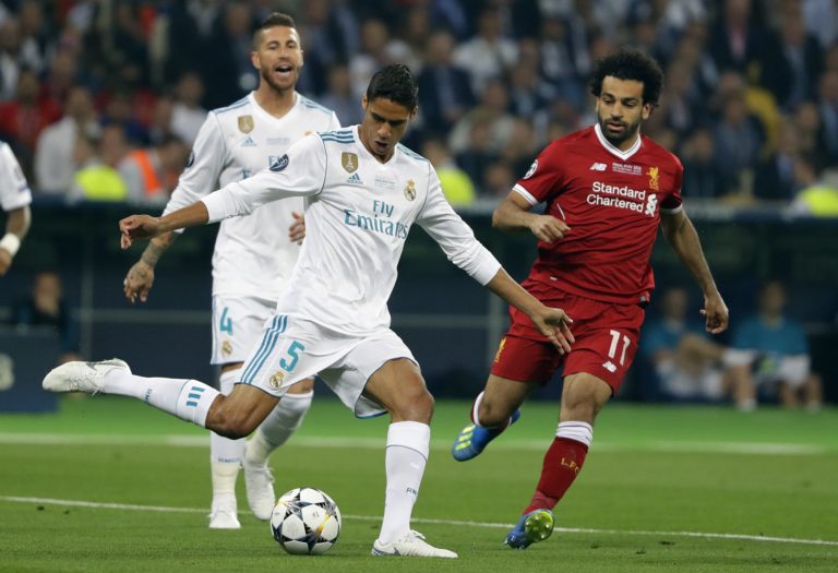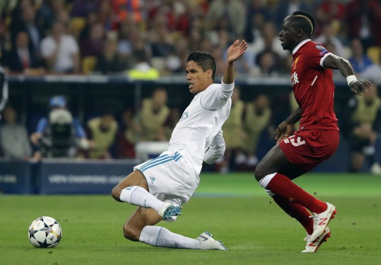 Raphael Varane z Realu Madrid v súboji proti Sadio Mane z FC Liverpool počas finále Ligy majstrov. 26. máj 2018 Foto: SITA/AP