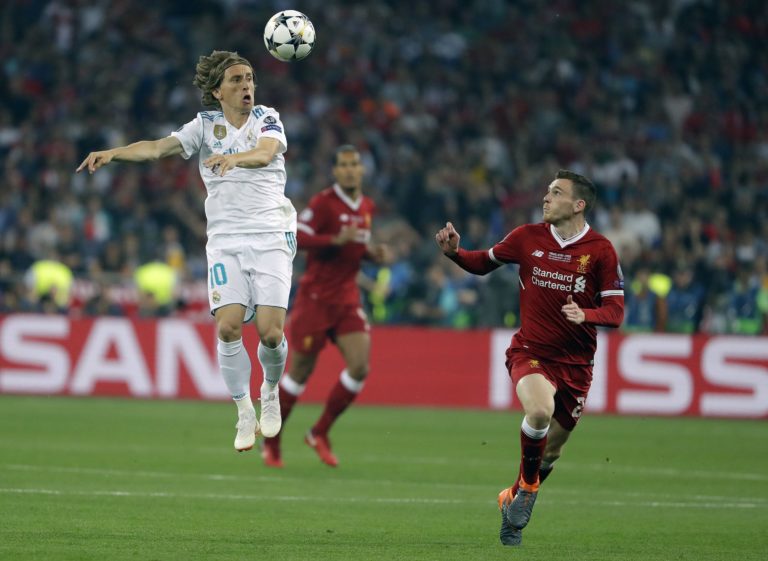 Luka Modric z Realu Madrid, vľavo, hlavičkuje počas finále Ligy majstrov proti FC Liverpool. 26. máj 2018 Foto: SITA/AP