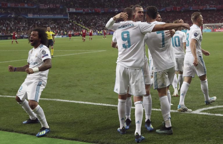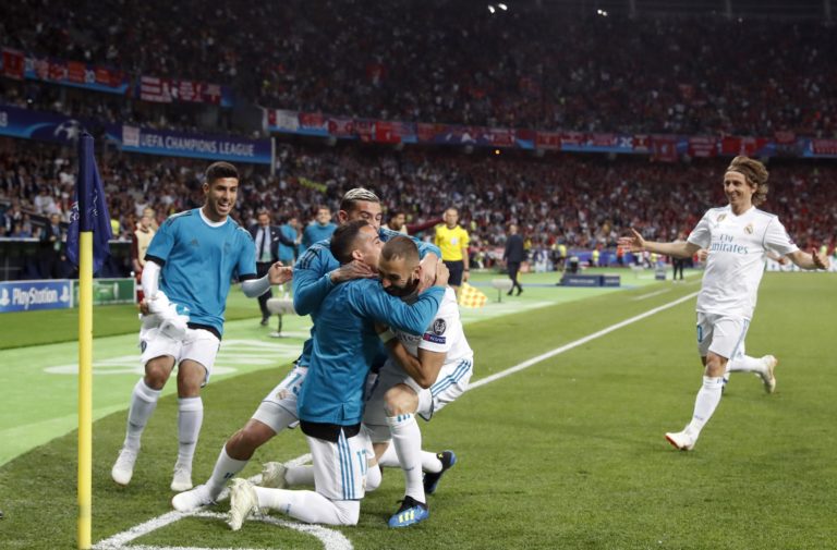 Radosť hráčov Realu Madrid po prvom góle Benzemu do siete FC Liverpool počas finále Ligy majstrov. 26. máj 2018 Foto: SITA/AP