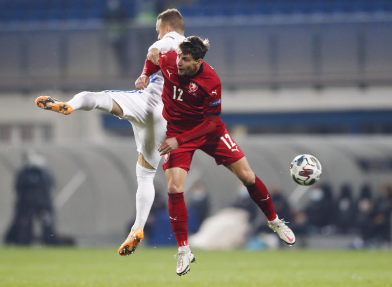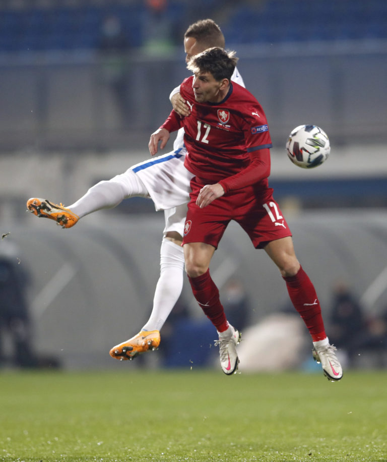 Český reprezentant Aleš Matějů v súboji so Slovákom Petrom Pekaríkom počas zápasu 2. skupiny B-divízie Ligy národov. Plzeň (Doosan Arena), 18. november 2020. Foto: SITA/AP.