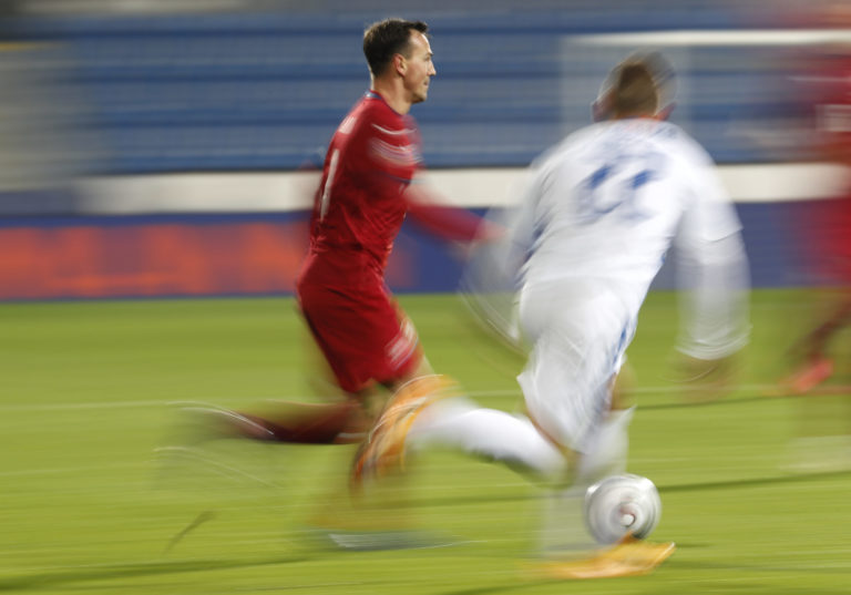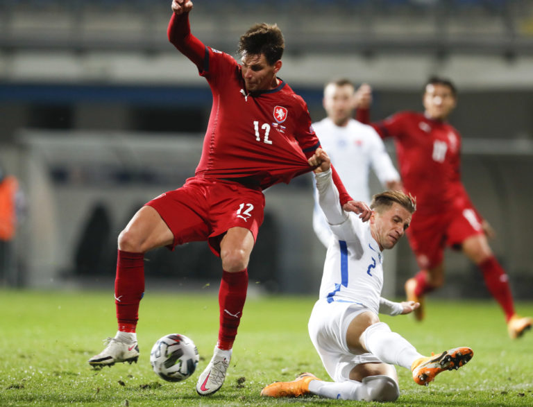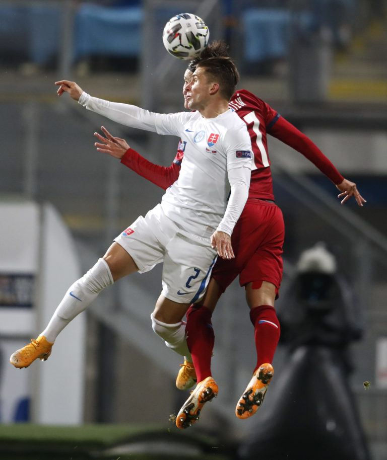 Slovenský reprezentant Peter Pekarík v súboji s Čechom Lukášom Masopustom počas zápasu 2. skupiny B-divízie Ligy národov. Plzeň (Doosan Arena), 18. november 2020. Foto: SITA/AP.