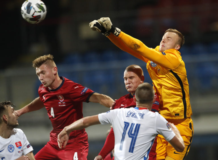Slovenský brankár Marek Rodák "boxuje" loptu po centri do pokutového územia počas zápasu 2. skupiny B-divízie Ligy národov proti Česku. Plzeň (Doosan Arena), 18. november 2020. Foto: SITA/AP.