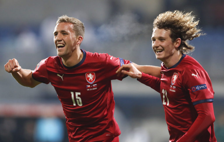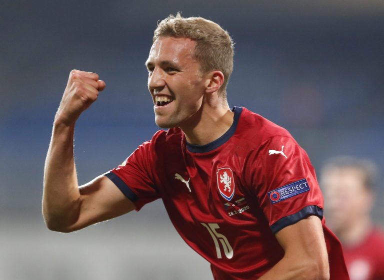 Český reprezentant Tomáš Souček sa teší z gólu v sieti Slovenska počas zápasu 2. skupiny B-divízie Ligy národov. Plzeň (Doosan Arena), 18. november 2020. Foto: SITA/AP.