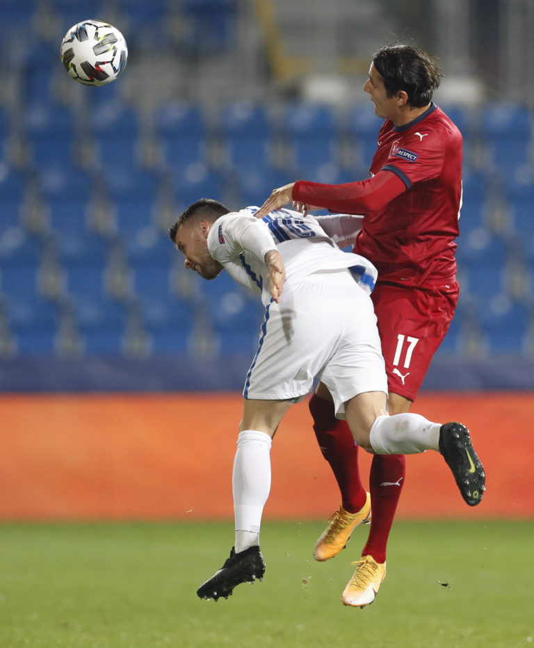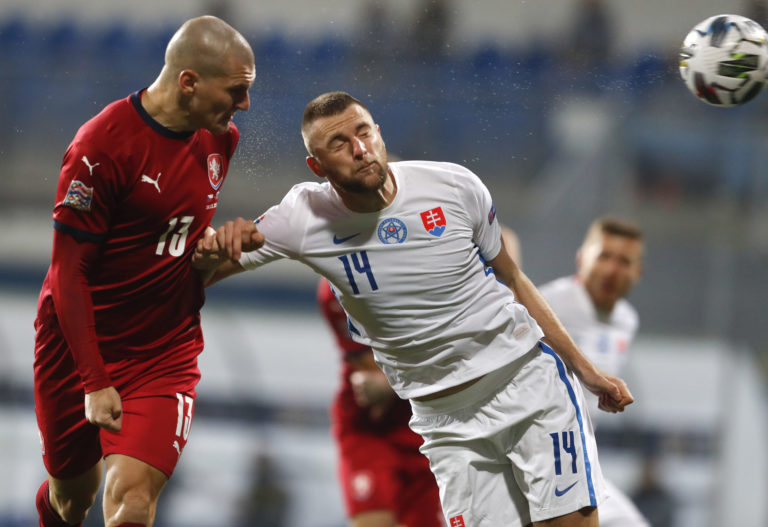 Zrážka slovenského reprezentanta Tomáša Hubočana s Čechom Vladimírom Coufalom počas zápasu 2. skupiny B-divízie Ligy národov. Plzeň (Doosan Arena), 18. november 2020. Foto: SITA/AP.