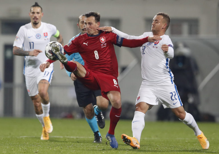 Slovenský reprezentant Stanislav Lobotka sa snaží zastaviť Čecha Vladimíra Daridu počas zápasu 2. skupiny B-divízie Ligy národov. Plzeň (Doosan Arena), 18. november 2020. Foto: SITA/AP.